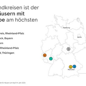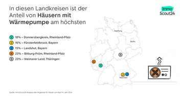 Der höchste Anteil von Einfamilienhäusern mit Wärmepumpen ist im Donnersbergkreis in Rheinland-Pfalz zu finden (18 %), dicht gefolgt von den bayrischen Landkreisen Fürstenfeldbruck (16 %) und Landshut (15 %). Im Osten zeigt sich im Weimarer Land ein überdurchschnittlicher Ausbau der Einfamilienhäuser mit Wärmepumpen (14 %). Bei der Ausbaugeschwindigkeit führt der Donnersbergkreis. Dort stieg der Anteil in Kaufangeboten seit 2022 um 16 Prozentpunkte von 2 auf 18 Prozent. Im Eifelkreis Bitburg-Prüm ist im selben Zeitraum der Anteil um 11 Punkte auf 14 Prozent angestiegen.