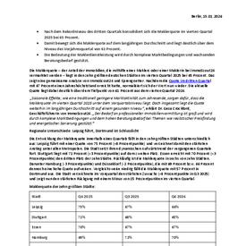 - Damit bewegt sich die Maklerquote auf dem langjährigen Durchschnitt und liegt deutlich über dem Niveau des Vorjahresquartal von 61 Prozent.