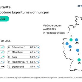 Die Entwicklung der Maklerquote innerhalb eines Quartals fällt in den zehn größten Städten unterschiedlich aus: Leipzig führt mit einer Quote von 75 Prozent (+8 Prozentpunkte) und verzeichnet damit den stärksten Anstieg unter allen Metropolen. Die Stadt setzt ihren dynamischen Aufwärtstrend der vergangenen Quartale fort. Stuttgart liegt mit 71 Prozent (+3 Prozentpunkte) auf dem zweiten Platz. Essen erreicht mit 70 Prozent (+3 Prozentpunkte) den dritten Platz der zehn Städte. Rückläufig ist die Maklerquote in sechs von zehn Städten. Darunter Hamburg (-3 Prozentpunkte) und Düsseldorf (-2 Prozentpunkte), die mit 69 Prozent bzw. 66 Prozent dennoch eine hohe Quote aufweisen. Vergleichsweise niedrig fällt die Maklerquote mit 57 Prozent in Dortmund aus. Die Stadt verzeichnete im Vorquartal den stärksten Zuwachs (+8 Prozentpunkte in Q3 2025) und zeigt nun den stärksten Rückgang mit einem Minus von 15 Prozentpunkten im vierten Quartal.