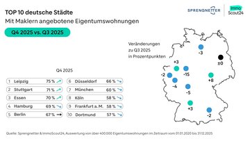 Die Maklerquote – der Anteil der Immobilien, die mithilfe eines Maklers oder einer Maklerin bei ImmoScout24 vermarktet werden – liegt in den zehn größten deutschen Städten im vierten Quartal 2025 bei 65 Prozent. Das zeigt eine gemeinsame Analyse von ImmoScout24 und Sprengnetter. Nachdem die Quote im dritten Quartal mit 67 Prozent einen Jahreshöchststand erreicht hatte, normalisiert sich der Wert nun wieder. Die aktuelle Quote liegt dabei deutlich über dem Tiefpunkt von 61 Prozent aus dem vierten Quartal 2024.