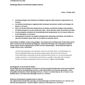 Auch in den acht Metropolen verlangsamt sich das Mietwachstum deutlich: Die durchschnittliche Angebotsmiete in den acht Metropolen (14,68 Euro) verzeichnet mit einem Quartalswachstum von +0,8 Prozent die schwächste Entwicklung seit 2020. Zuwächse zeigen sich besonders in Frankfurt am Main (14,67 Euro pro Quadratmeter) und Stuttgart (14,92 Euro) mit jeweils +1,2 Prozent. Eine moderate Entwicklung zeigen München (-0,2 Prozent), Leipzig (+0,5 Prozent auf 8,81 Euro), Hamburg (+0,6 Prozent) und Berlin (+0,7 Prozent).