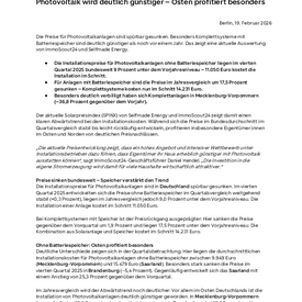Im Jahresvergleich wird der Abwärtstrend noch deutlicher: Vor allem im Osten Deutschlands ist die Installation von Photovoltaikanlagen deutlich günstiger geworden. In Mecklenburg-Vorpommern liegen die Preise 23,0 Prozent unter dem Vorjahresniveau, in Brandenburg bei 19,2 Prozent und in Berlin bei 15,5 Prozent.